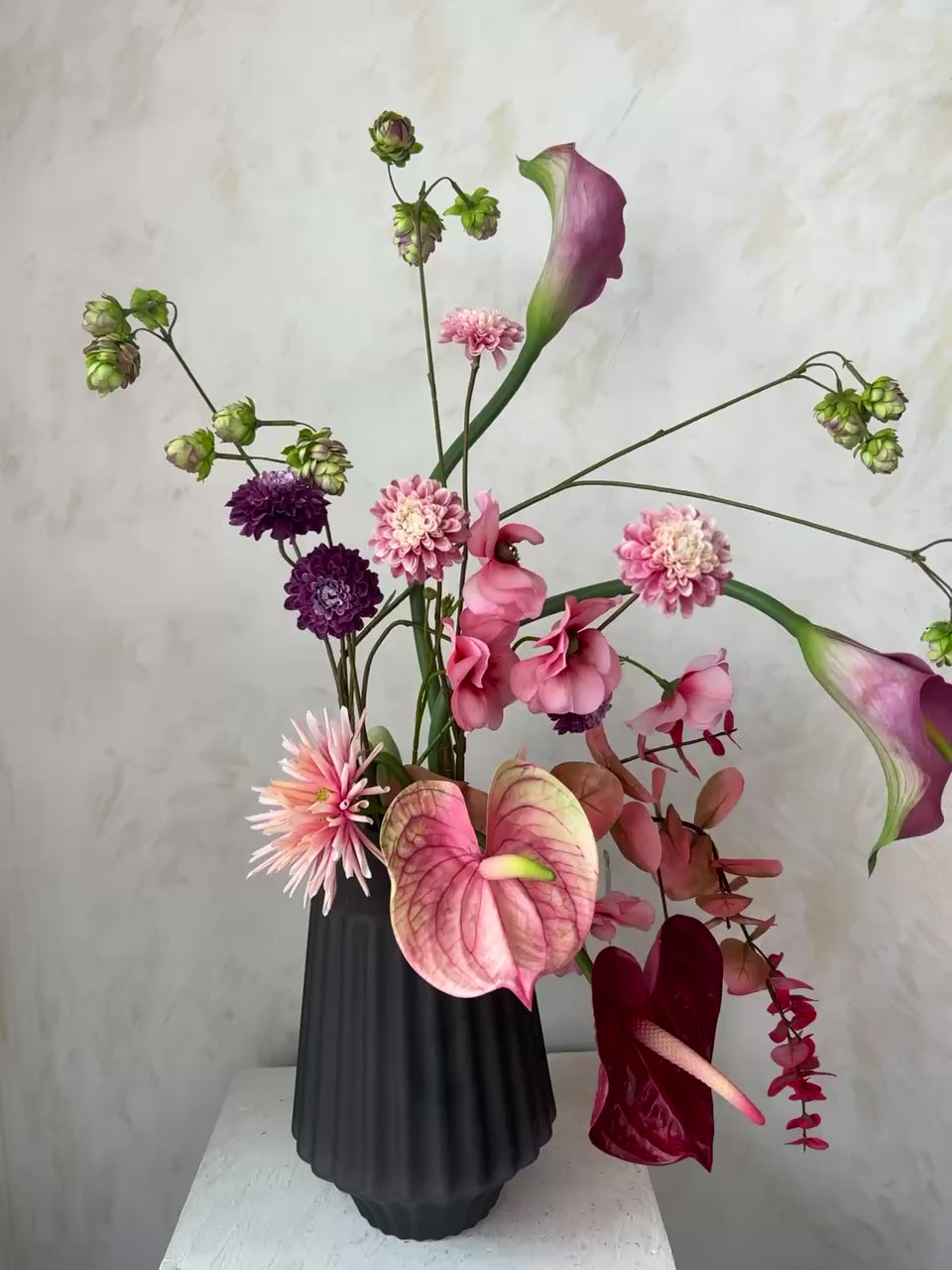 סידור פרחים יוקרתי ומלא נוכחות, המשלב גוונים רכים של ורוד, סגול ובורדו בקומפוזיציה פתוחה ואלגנטית. שילוב של קאלות דרמטיות, אנטוריום מרשים, דליות ופרחים משלימים יוצר מראה טבעי אך מוקפד, עם תנועה וגובה שמוסיפים עומק ואופי לכל חלל.