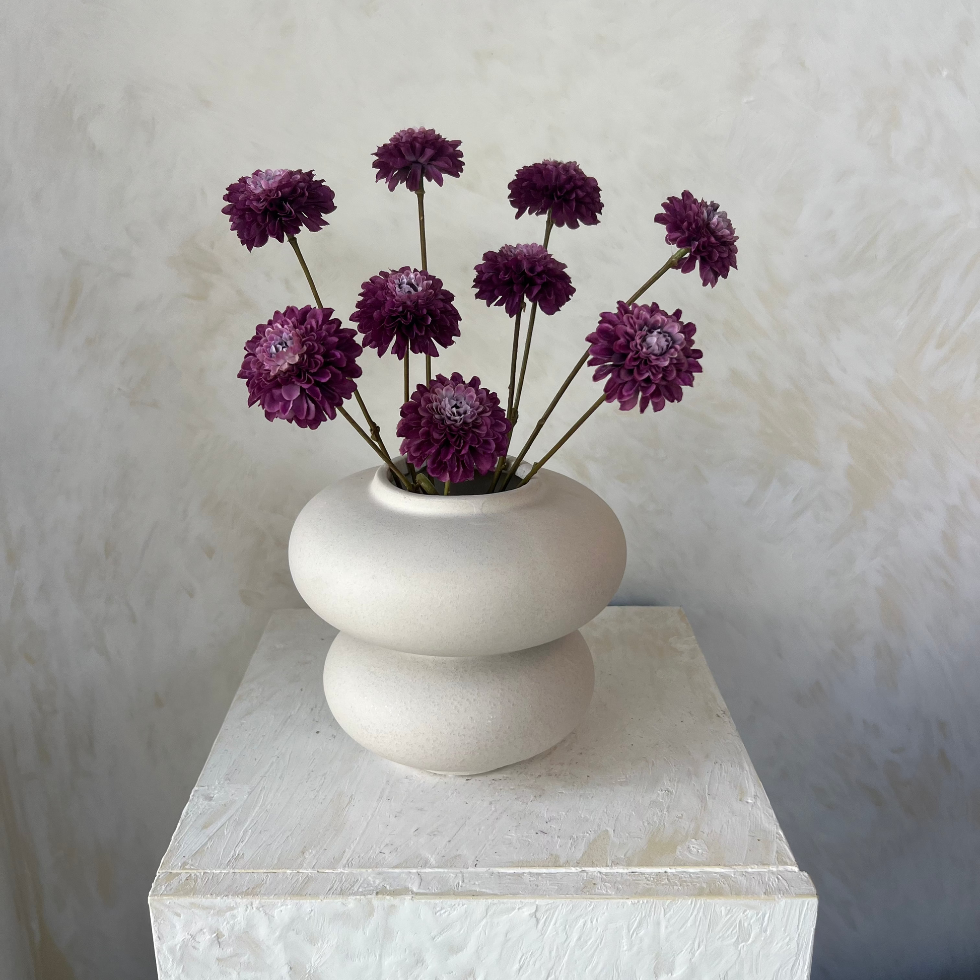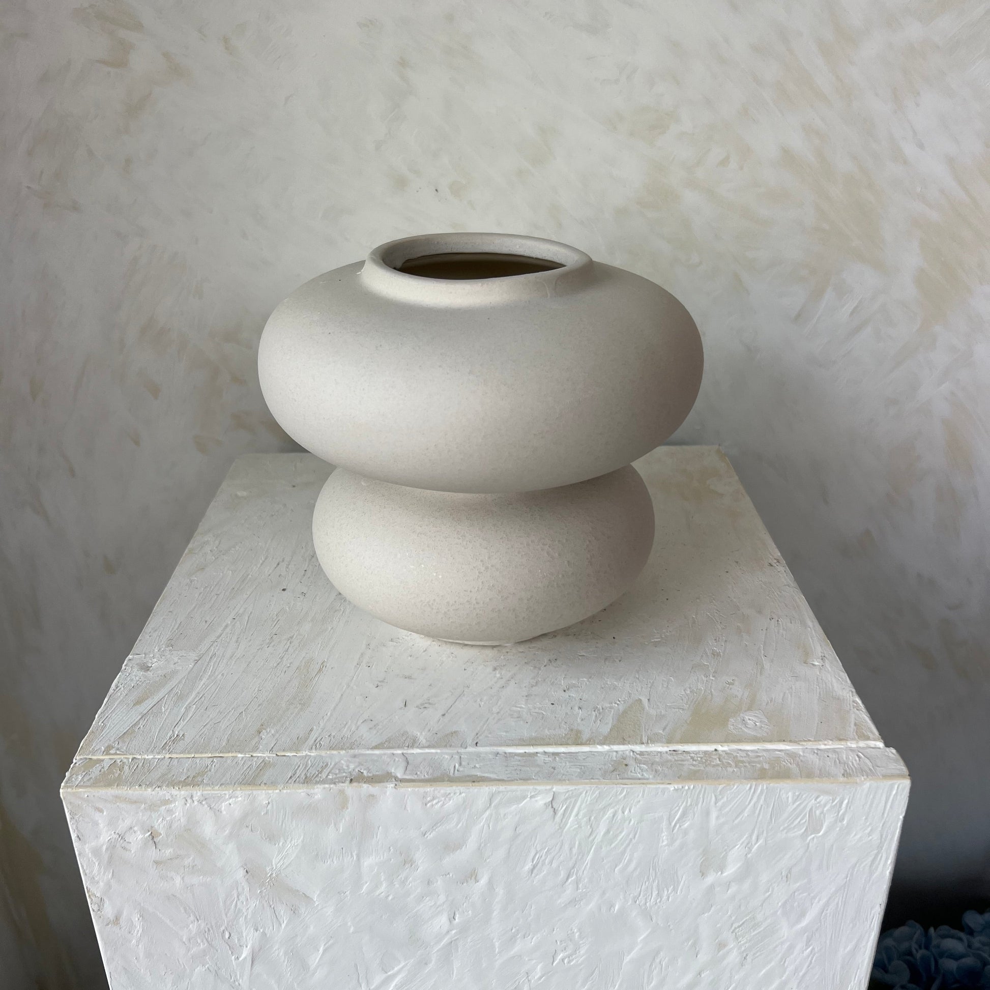 אגרטל קרמיקה בעיצוב אובלי רך עם פרופורציות מאוזנות ושתי קומות מעוגלות, היוצר מראה פיסולי ואלגנטי. הגימור הבהיר והמרקם העדין מעניקים לו נוכחות שקטה ומודרנית, שמוסיפה עומק וסטייל לכל חלל.