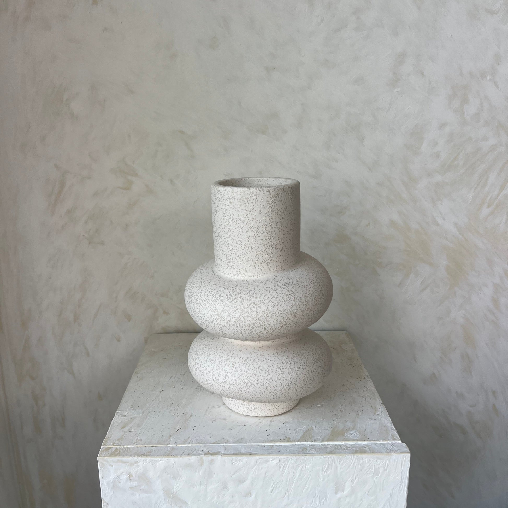 אגרטל קרמיקה פיסולי בעל קווים מעוגלים ושתי קומות רכות, היוצר מראה מודרני ומעודן עם נוכחות עיצובית מרשימה. הגימור הבהיר והמרקם העדין מעניקים לו תחושת רוך, איזון ואלגנטיות – כזה שמשתלב באופן טבעי בכל חלל.