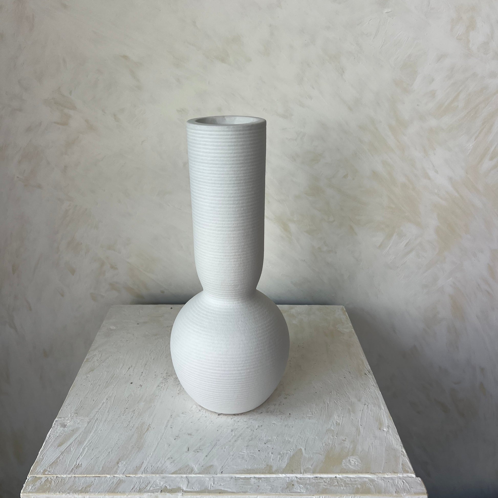 אגרטל קרמיקה פיסולי המשלב בסיס כדורי רך עם צוואר צר וגבוה, ליצירת סילואטה מודרנית, מאוזנת ומלאת אופי. הגימור הלבן והטקסטורה העדינה מעניקים לו מראה נקי ויוקרתי שמתאים לכל חלל מעוצב.