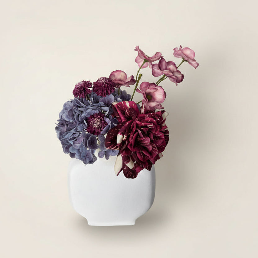הסידור מוצב בכלי קרמיקה לבן בעל קווים נקיים, שמבליט את עומק הצבעים ויוצר נוכחות יוקרתית ומאוזנת בכל חלל – סלון, חדר שינה, משרד או פינת אירוח.