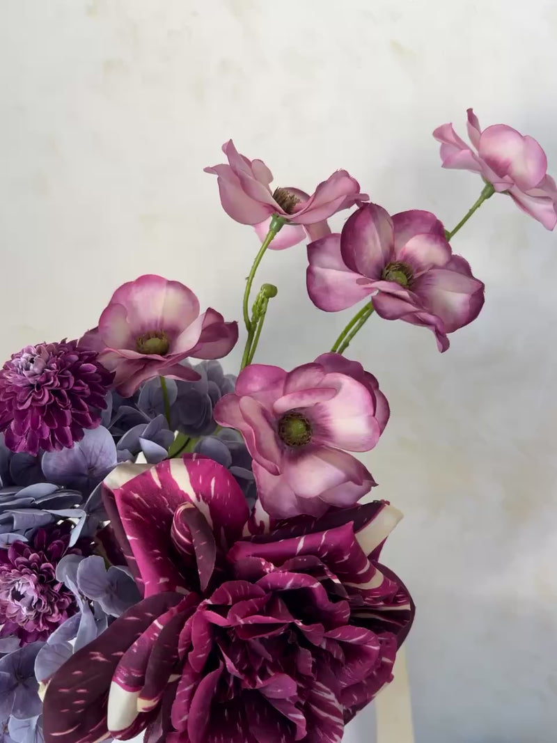 סידור פרחים עמוק, אלגנטי ומלא שכבות בגוונים של סגול, בורדו, ורוד עתיק ולילך – קומפוזיציה עשירה שמשלבת רוך עם דרמה עיצובית. שילוב של ורדים, פרחים בוטניים והידראנג׳ה יוצר מראה רומנטי־אומנותי, כזה שמרגיש כמו יצירת סטיילינג ולא רק זר.