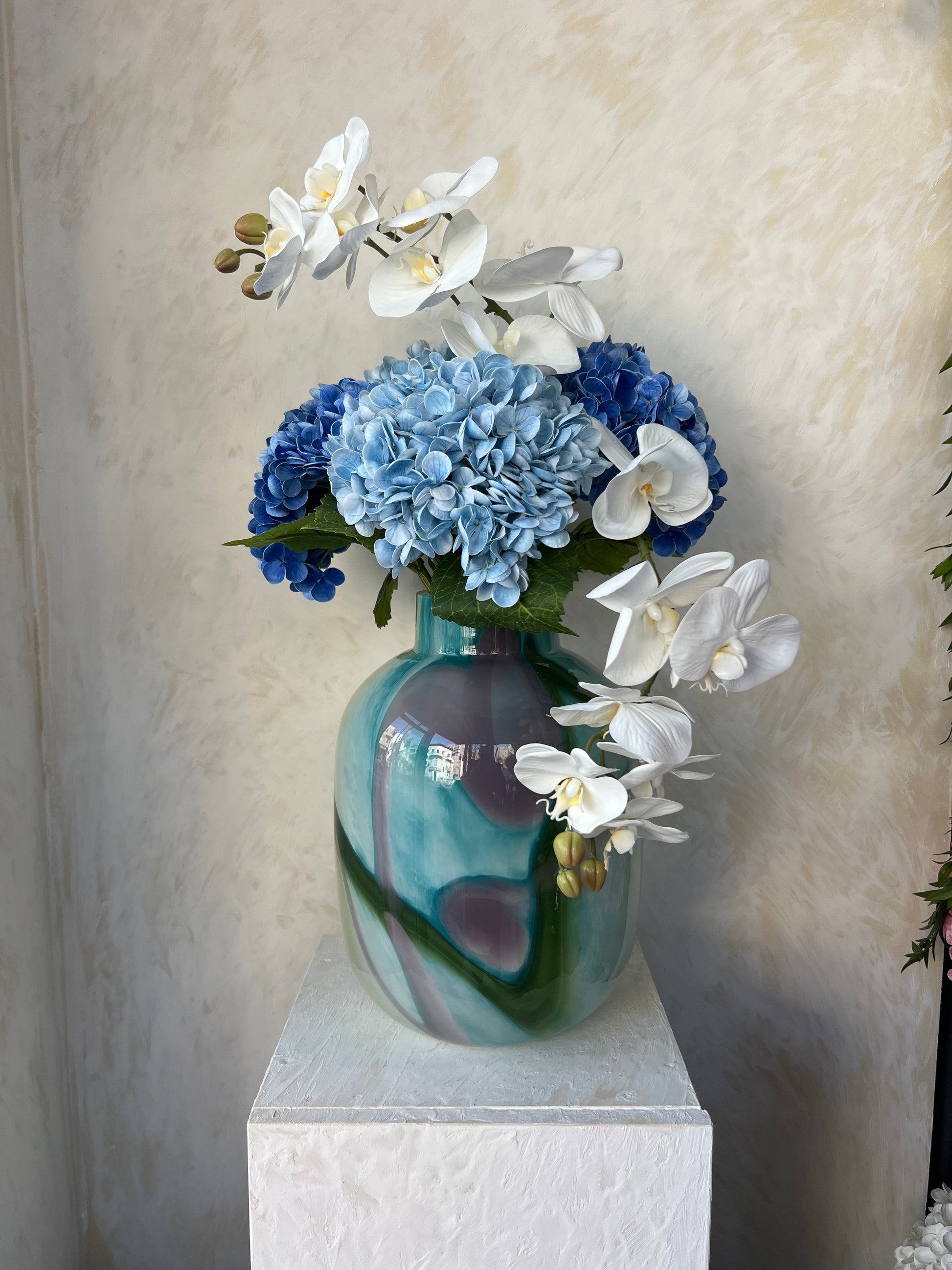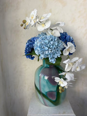 3 גבעולי הורטנזיה בגוונים של כחולף 2 סחלבים לבנים