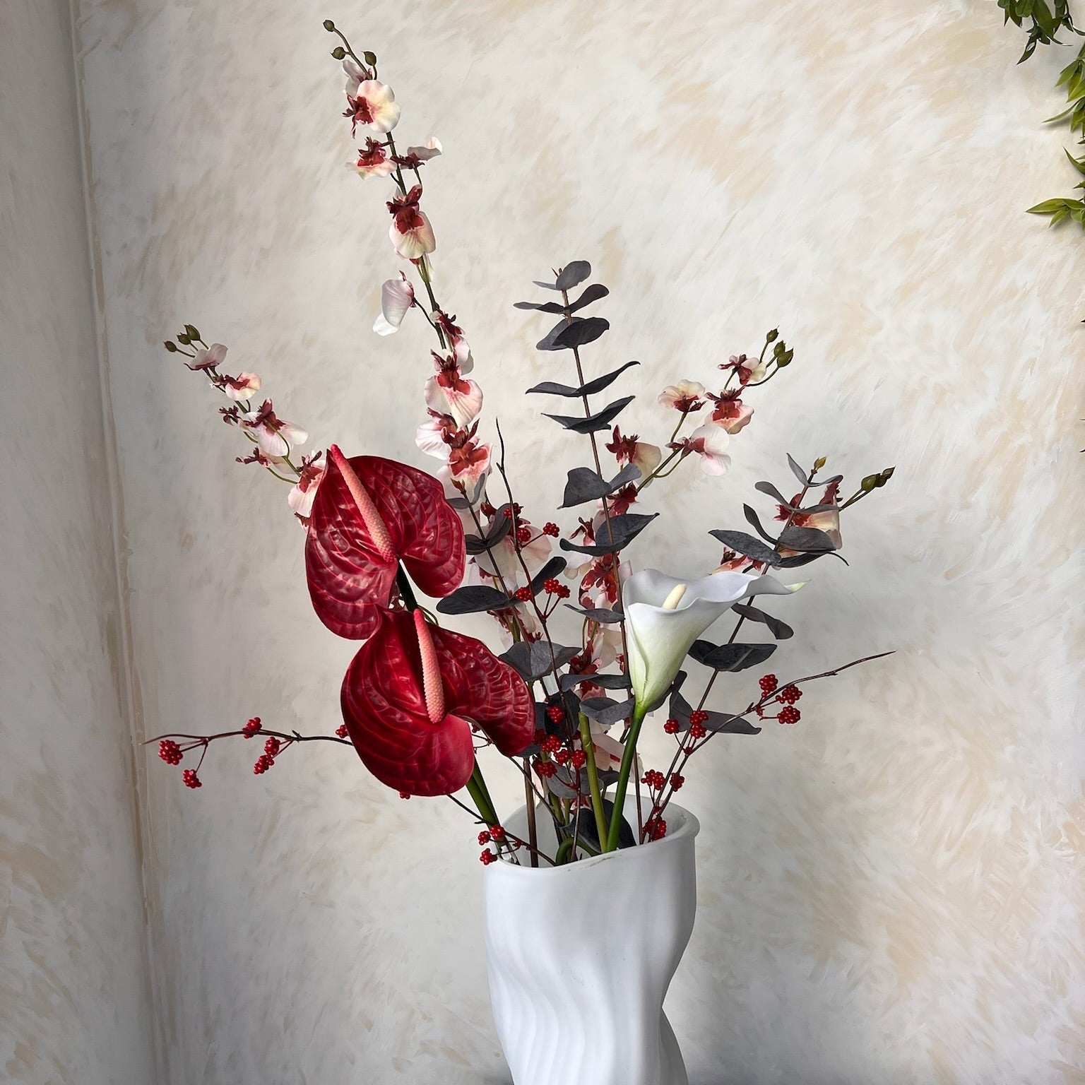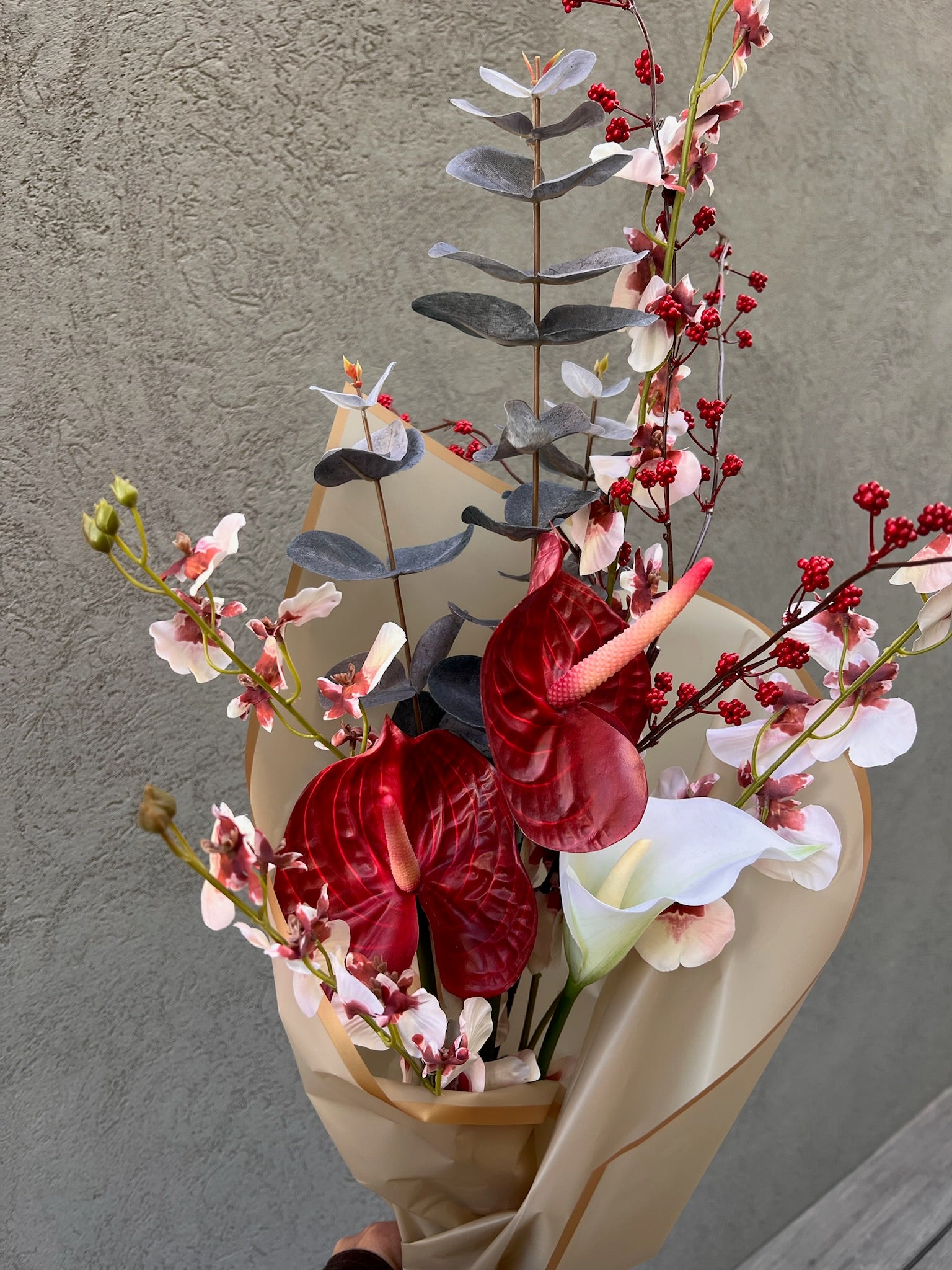 2 גבעולי אנטוריום אדום, סחלב לבן ואדום, קאלה, אקליפטוס וענף פירות אדום