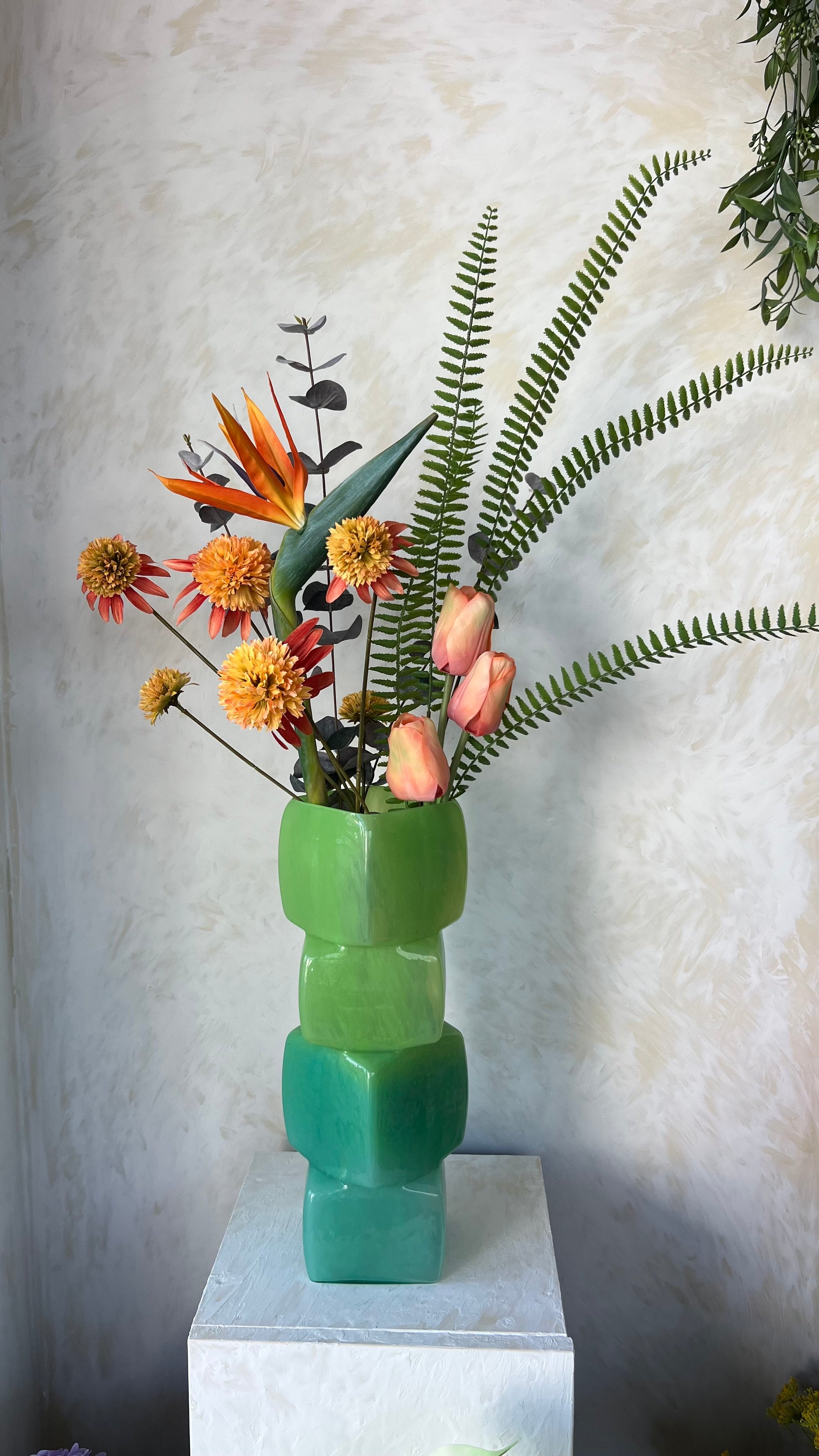גבעול אקליפטוס, 3 גבעולי טוליפ כתום, 2 דליה כתום, ציפור גן עדן ושרך ירוק