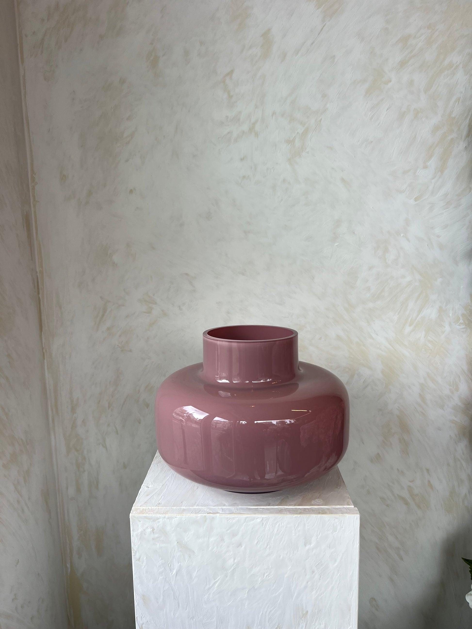 כלי זכוכית אלגנטי ועכשווי, בעל צורה מעוגלת ורחבה המדגישה יציבות, רוך ותחושת יוקרה. הגוון הסגול-ורדרד העמוק יוצר נוכחות רכה אך מרשימה, כזו שמוסיפה חמימות וצבע מעודן לכל חלל.