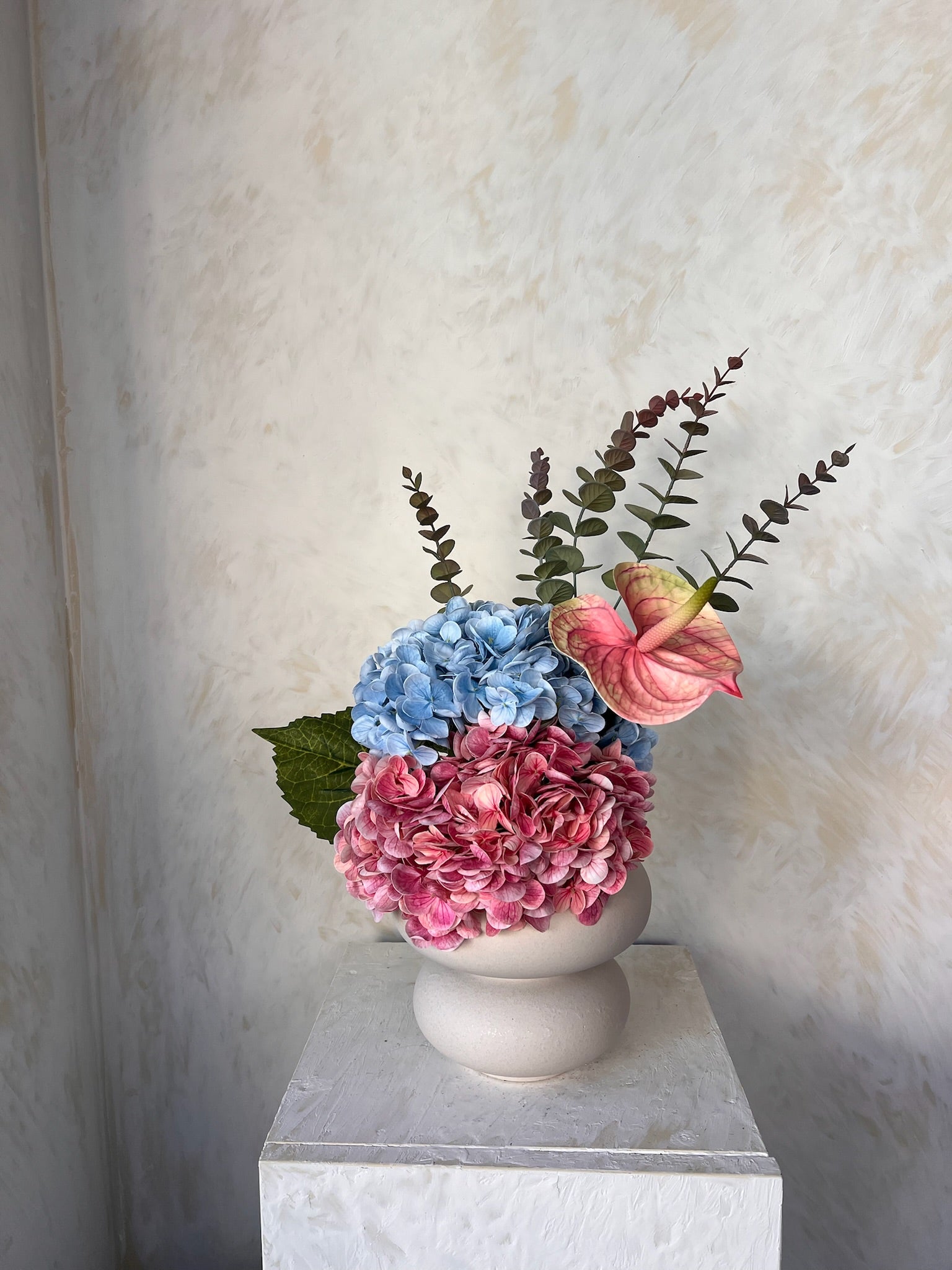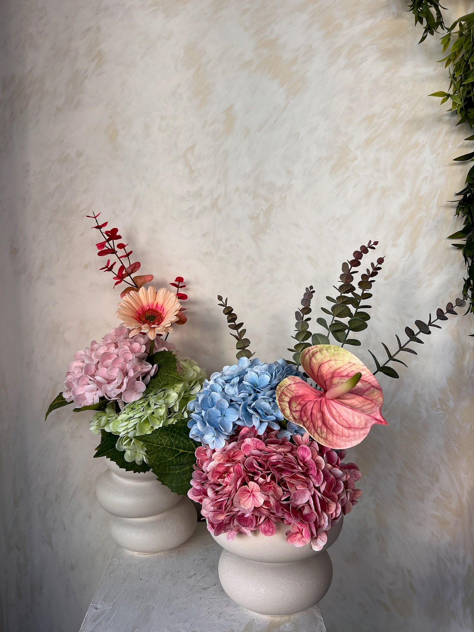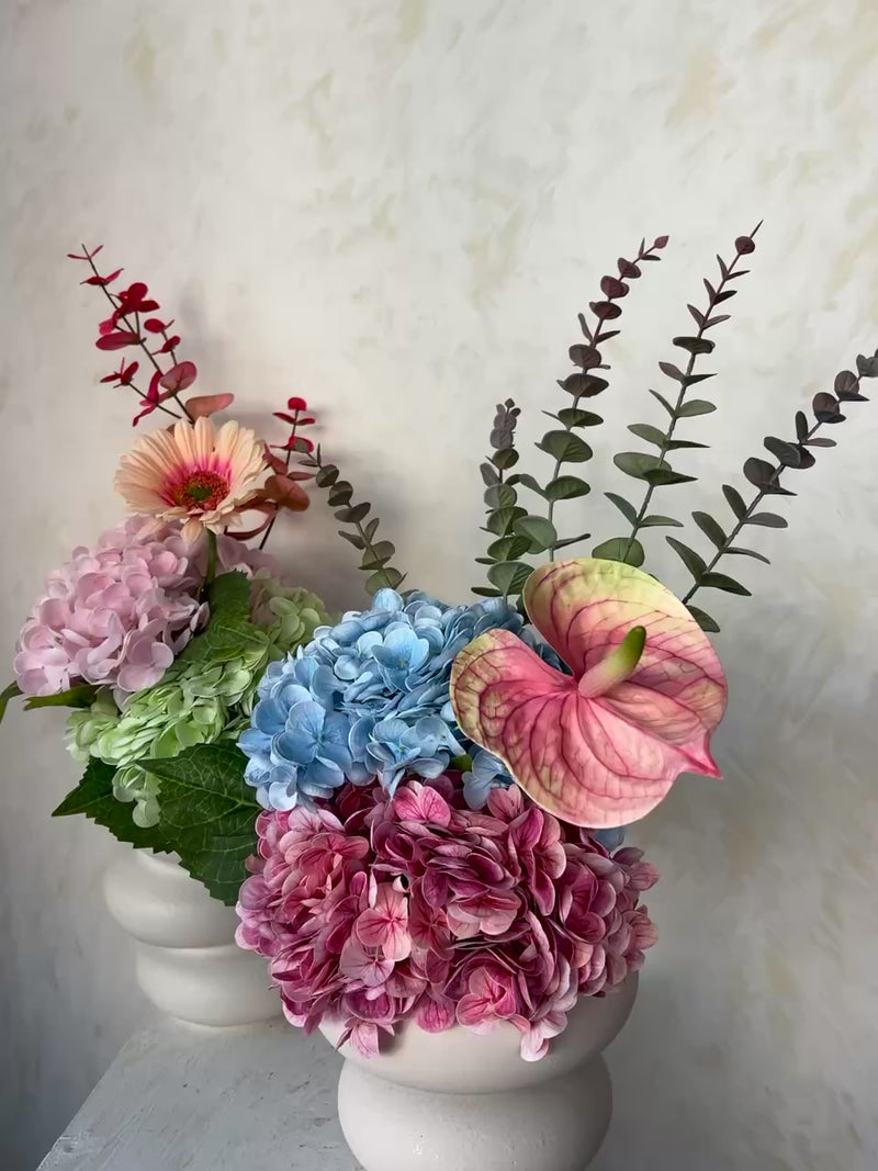 שני הסידורים יוצרים יחד קומפוזיציה מאוזנת של צבע, טקסטורה ותנועה: שילוב בין הורטנזיות בגווני ורוד עתיק, לבן־אפור וירוק ליים רענן, לצד אנתוריום ורוד דו־גוני המעניק נוכחות פסטלונית ונגיעה דרמטית.