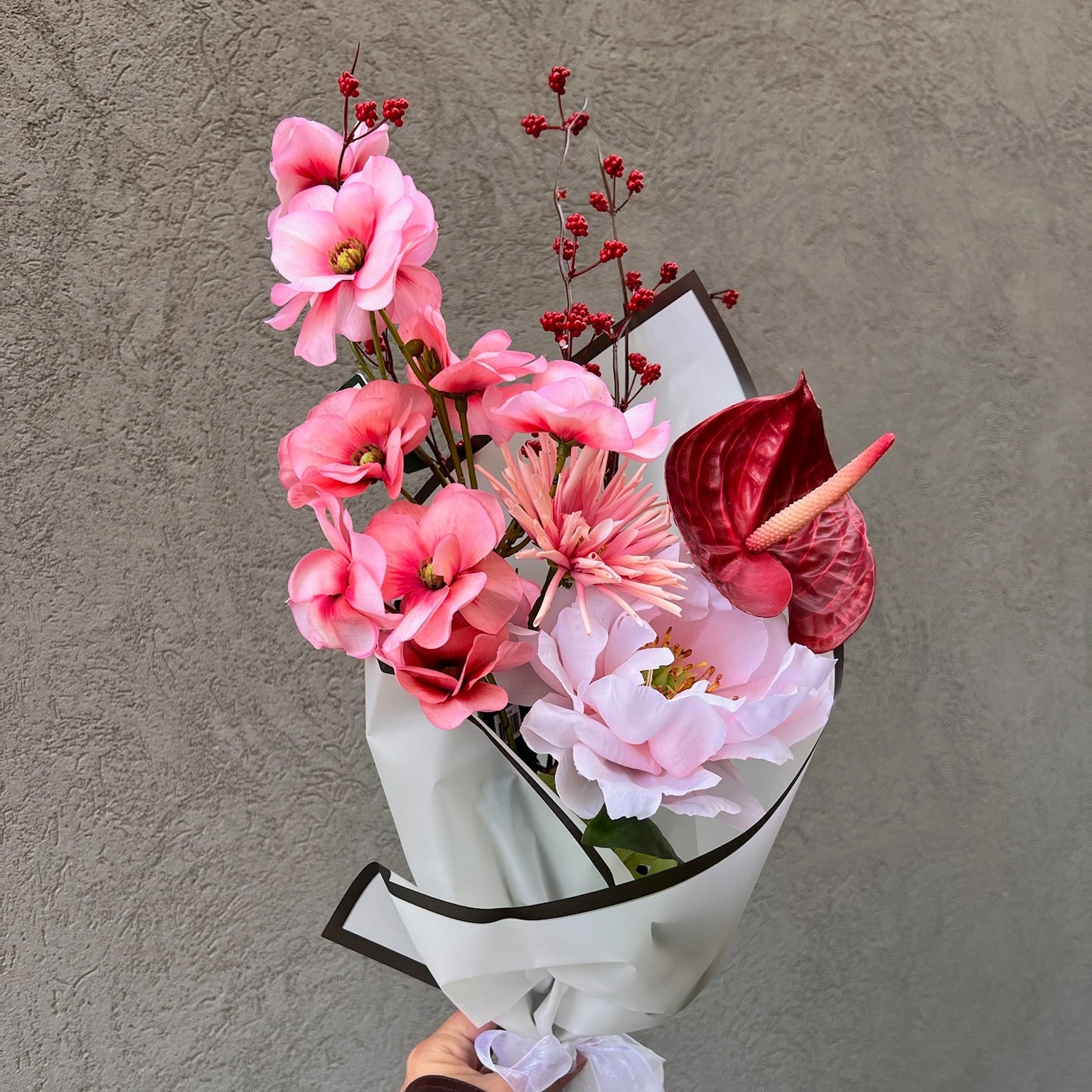 השילוב בין פרחים פתוחים לניצנים עדינים מעניק תחושת תנועה טבעית ומראה שופע, המדמה סידור פרחים טריים שנקטפו זה עתה – אך נשמר יפיפה לאורך שנים ללא תחזוקה.