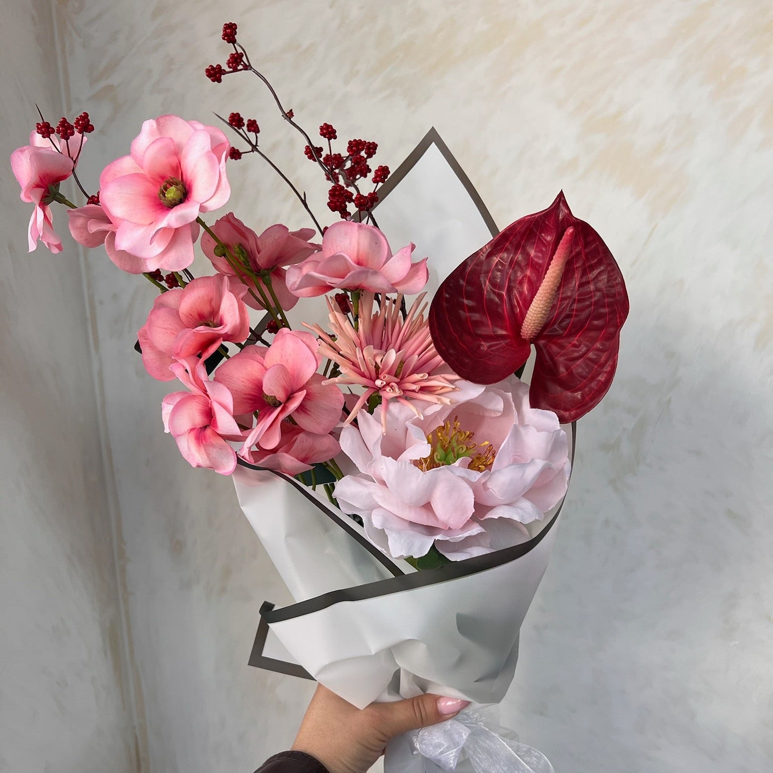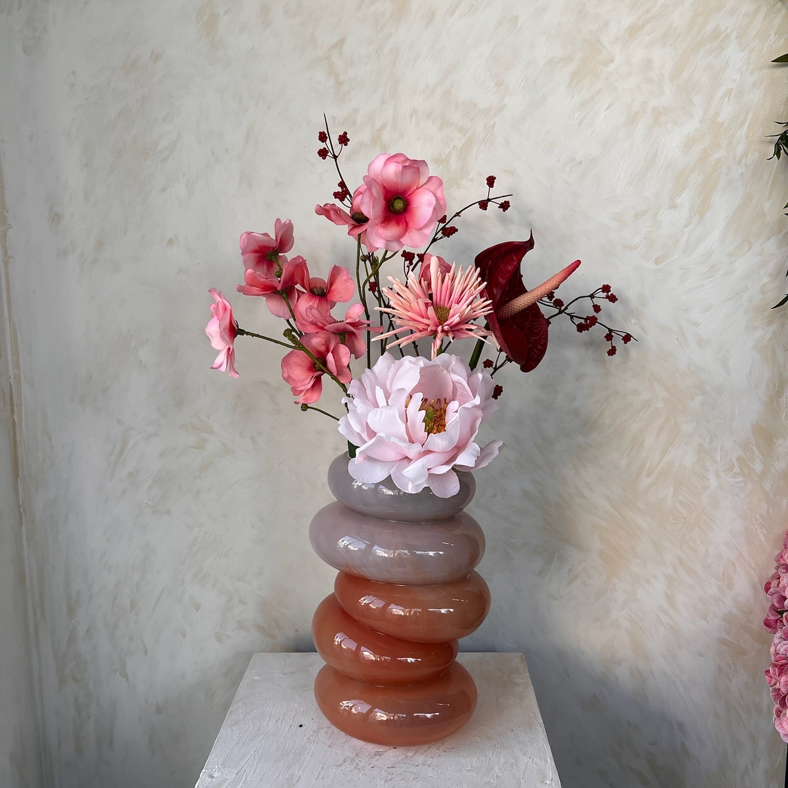סידור פרחים עשיר ועדין המשלב פרחי משי איכותיים במראה טבעי במיוחד, בגווני ורוד רך, פודרה ונגיעות בורדו עמוקות. הקומפוזיציה יוצרת מראה רומנטי, אלגנטי ומלא עומק – כזה שמוסיף נוכחות וחיים לכל חלל.