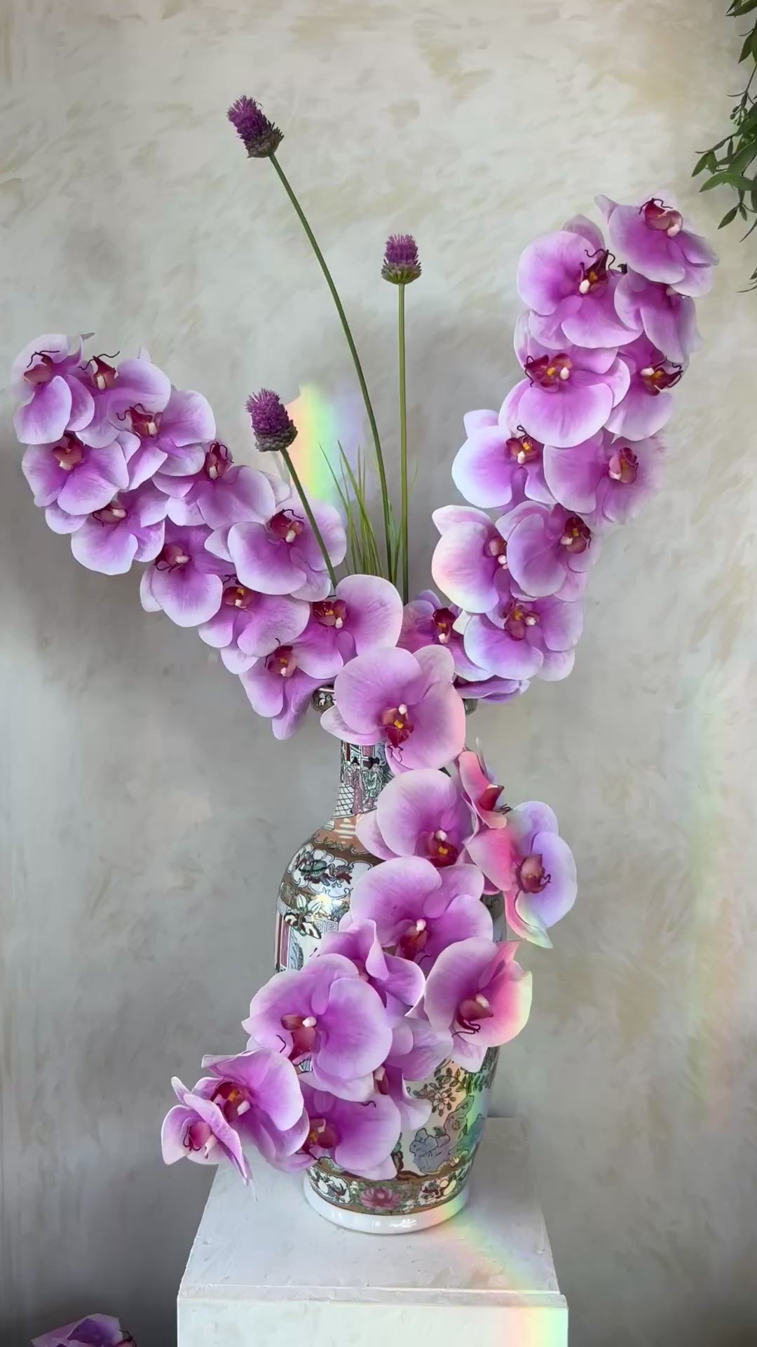 סידור פרחי משי דרמטי ומרשים במיוחד, המורכב מסחלבים בגוון ורוד-סגלגל עשיר עם מעברי צבע עדינים ולב פרח מודגש. הקומפוזיציה פיסולית ובעלת נוכחות חזקה, עם קווים מתעגלים וזרימה טבעית שיוצרים תחושת תנועה אלגנטית וגובה מרשים.