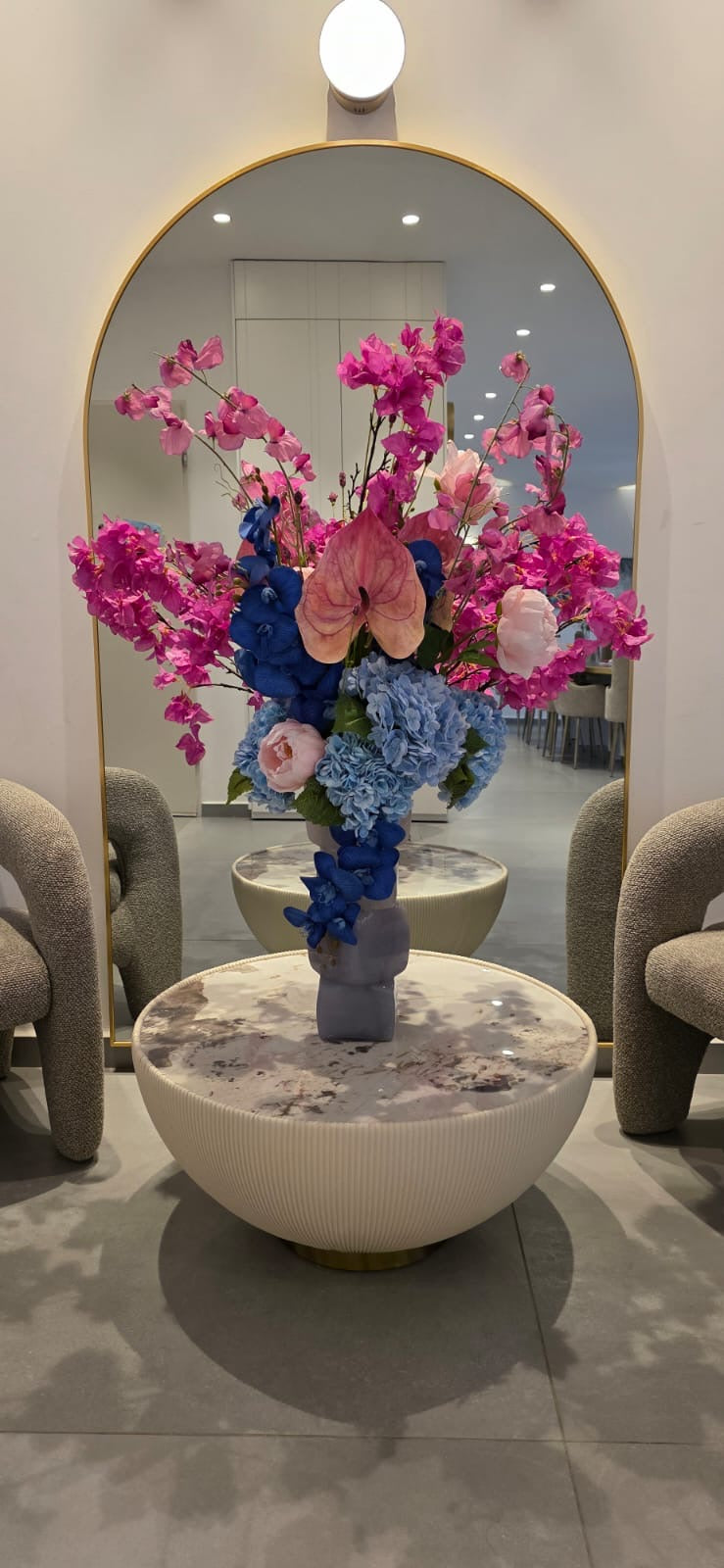 שילוב מרשים ועוצמתי של פרחי משי פרמיום בגווני ורוד נועז וכחול עמוק, שמעניקים תחושת רעננות מודרנית וחושנית כאחד. העבודה בנויה מצבעים משלימים שיוצרים איזון בין עדינות לאומנות, והרכב הפרחים מייצר מראה “חי” ומלא תנועה – בדיוק כמו פרחים טריים, רק שתמיד נשארים מושלמים.
