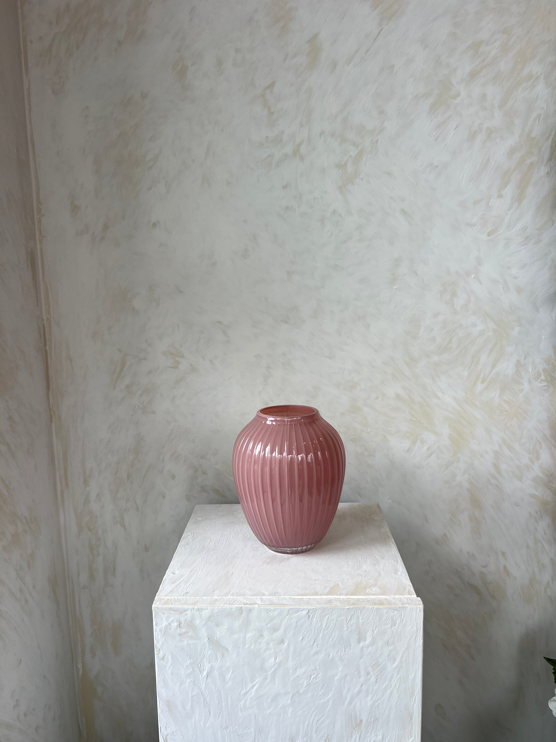 כלי זכוכית ורוד בעיצוב אלגנטי ופיסולי, עם חריצים אנכיים עדינים שיוצרים משחקי אור וצל ומעניקים לכלי מראה יוקרתי ומלא עומק. הגוון הוורוד-מעושן מוסיף רכות נשית ותחושת חמימות, ומכניס טאץ’ של סטייל עכשווי לכל חלל.