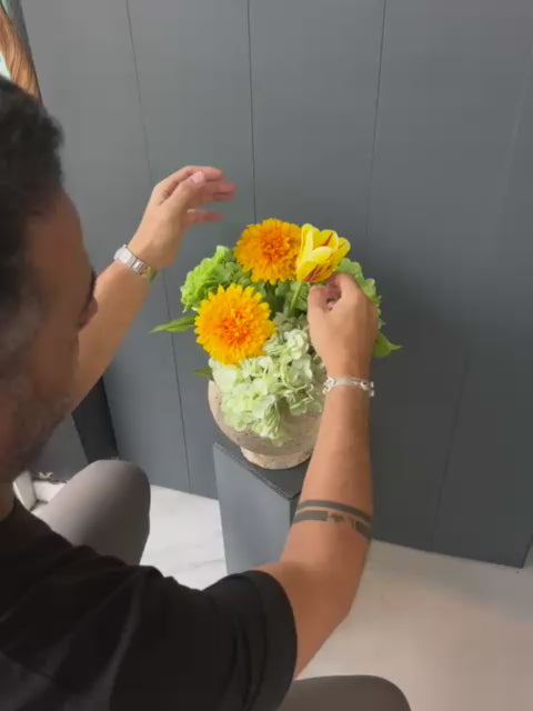 זר פרחים בצבעי ירוק וכתום, המשלב עלים ופרחים באיכות מושלמת להענקת מראה רענן, טבעי ומלא חיים. שילוב הצבעים הייחודי יוצר תחושת חום ואנרגיה, ומתאים להוספת טאץ' מעוצב לכל חלל – סלון, מטבח, חדר שינה או משרד.