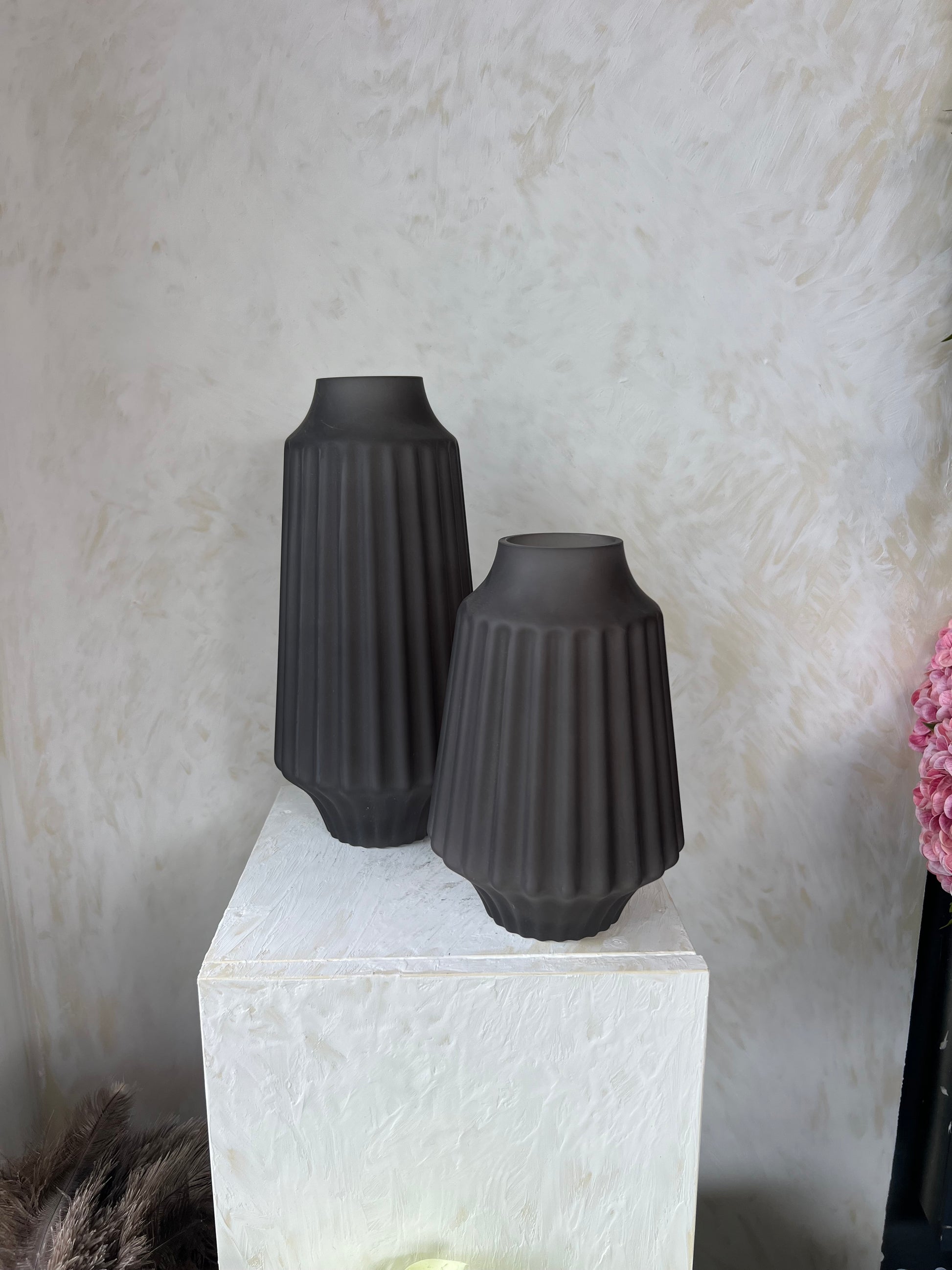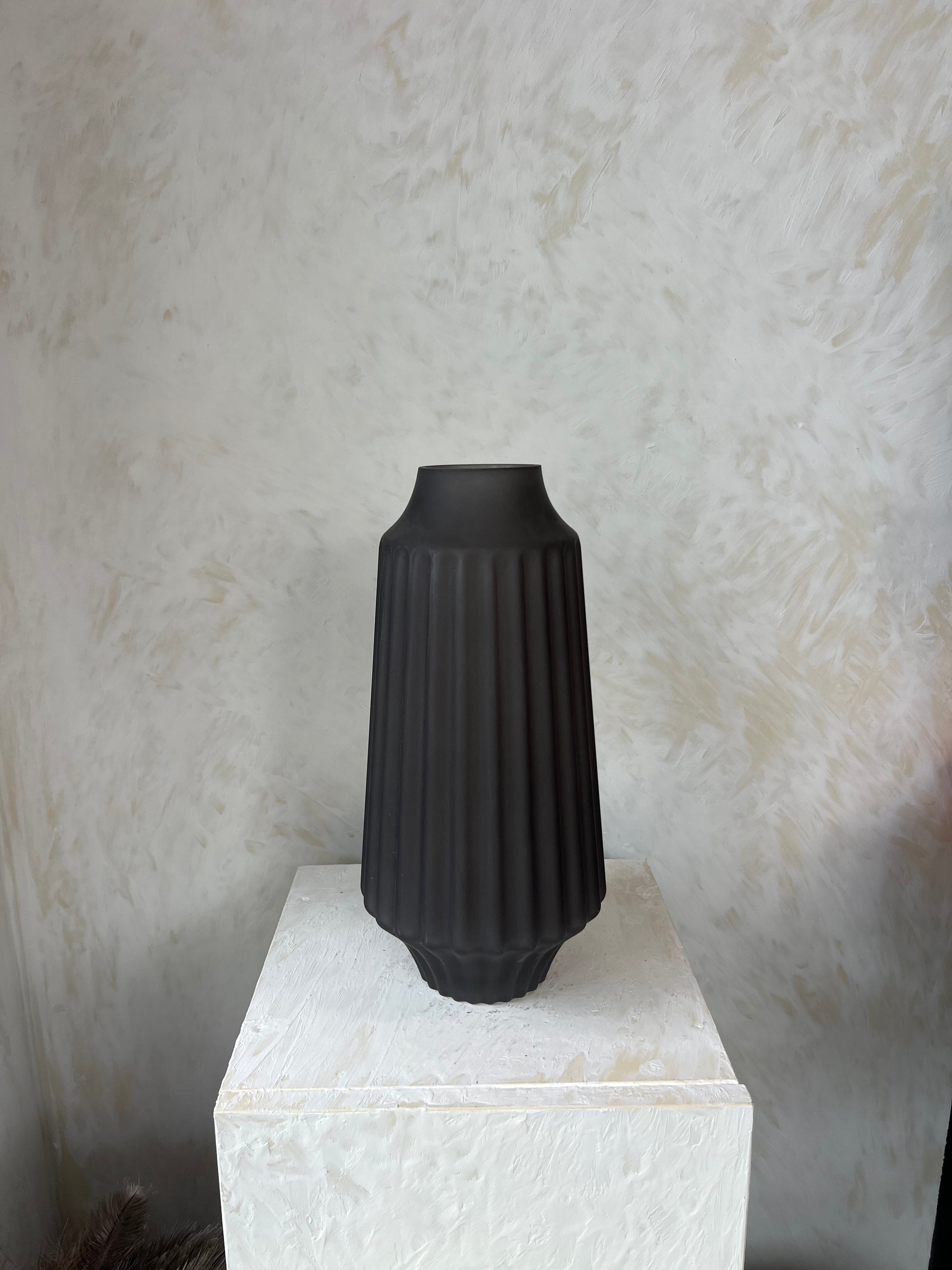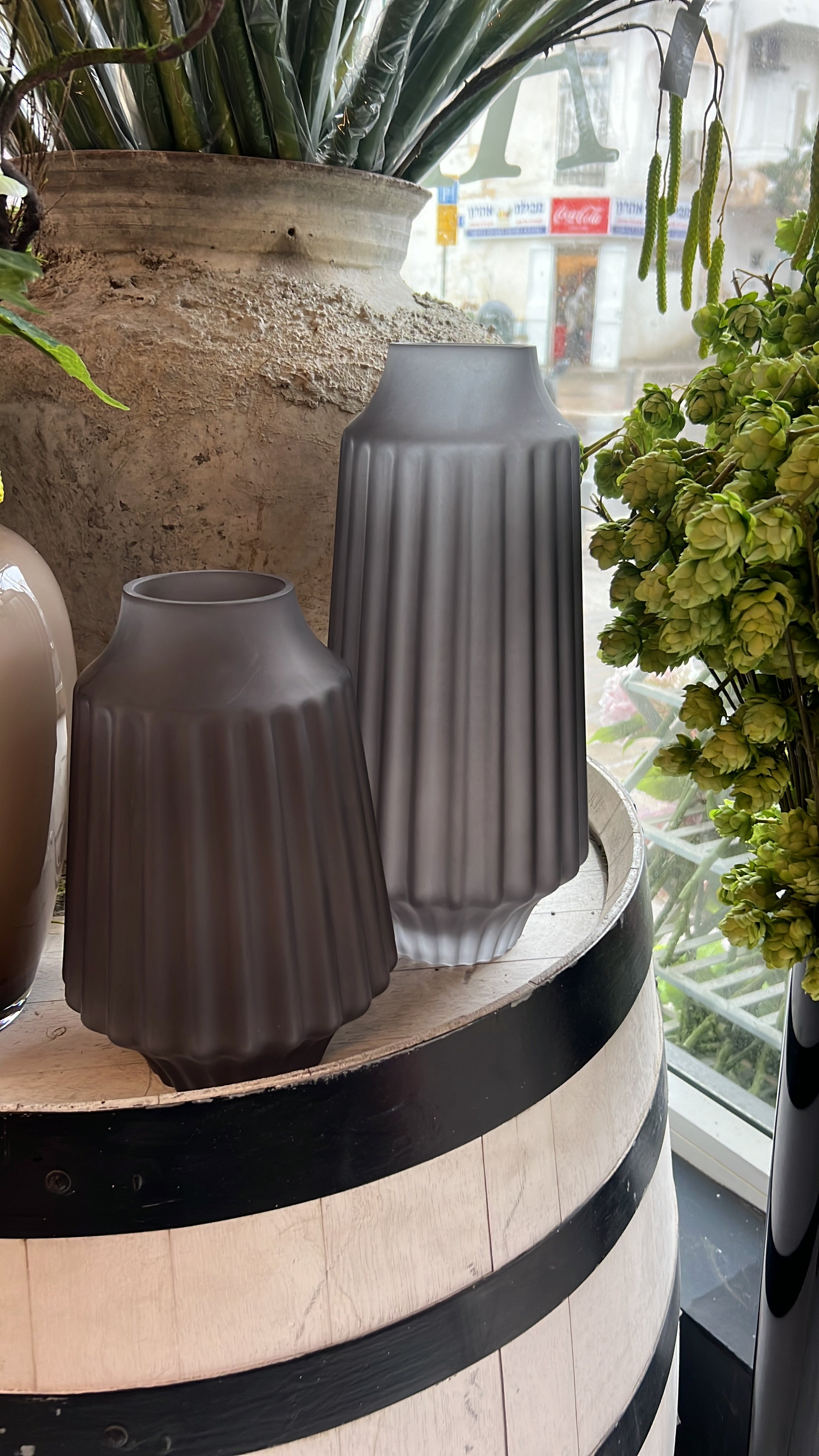 אגרטל זכוכית אפור מט בעיצוב אדריכלי מודרני, בעל חריצים אנכיים עדינים שיוצרים קצב, עומק ותחושת תנועה סביב הכלי. הצורה האלגנטית – רחבה בתחתית ומתכנסת כלפי מעלה – מעניקה לו יציבות ונוכחות שקטה אך עוצמתית.