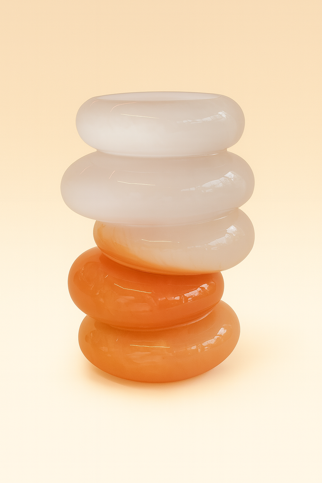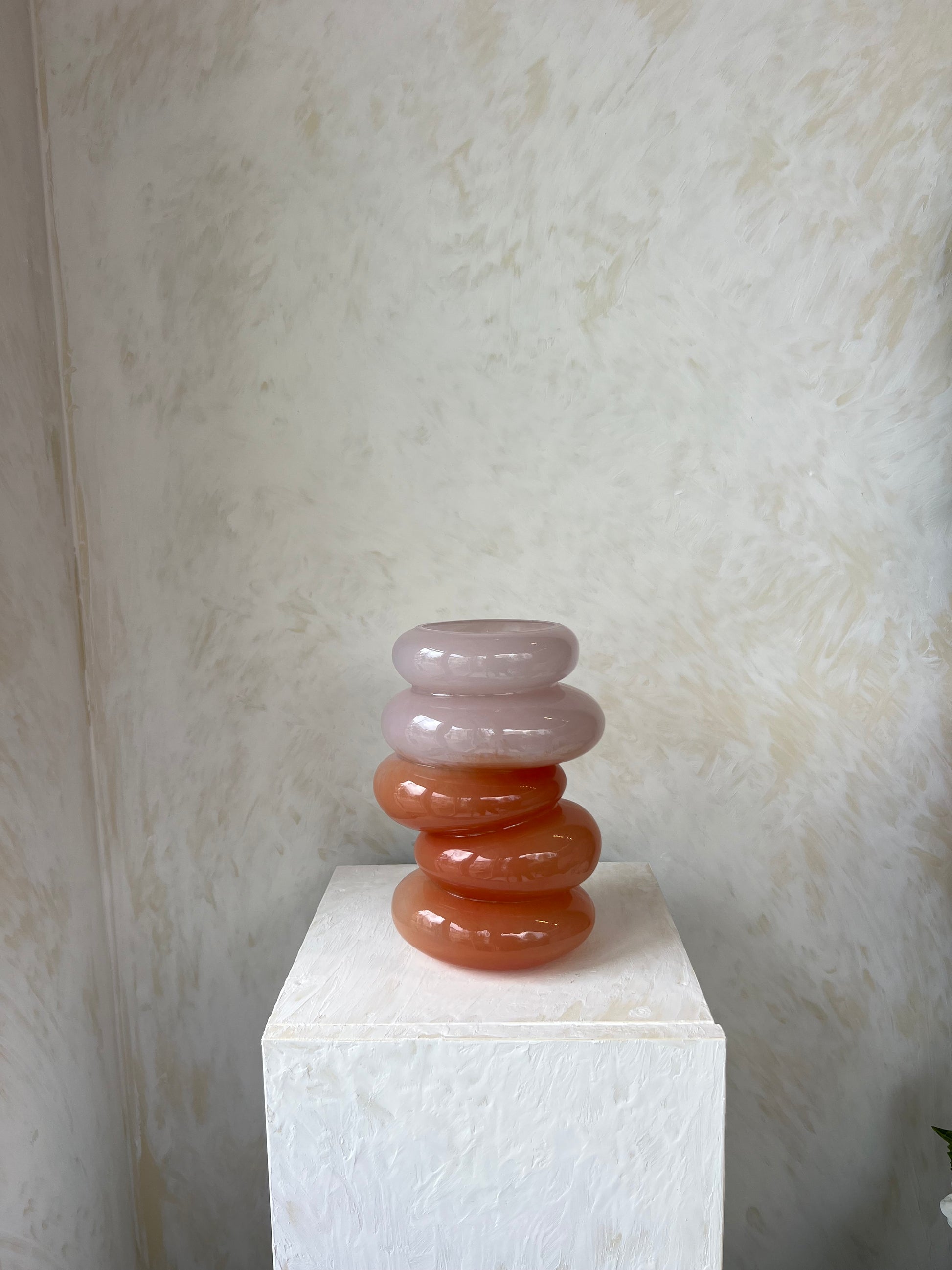 כלי זכוכית פיסולי ומודרני, הבנוי משכבות עגולות המדורגות זו על גבי זו ויוצרות מראה גאומטרי רך ומלא תנועה. שילוב הגוונים – ורוד מעושן בחלק העליון וכתום־ענברי חמים בתחתית – יוצר קונטרסט אלגנטי ועשיר, שמכניס עומק, אור ואופי לכל חלל.