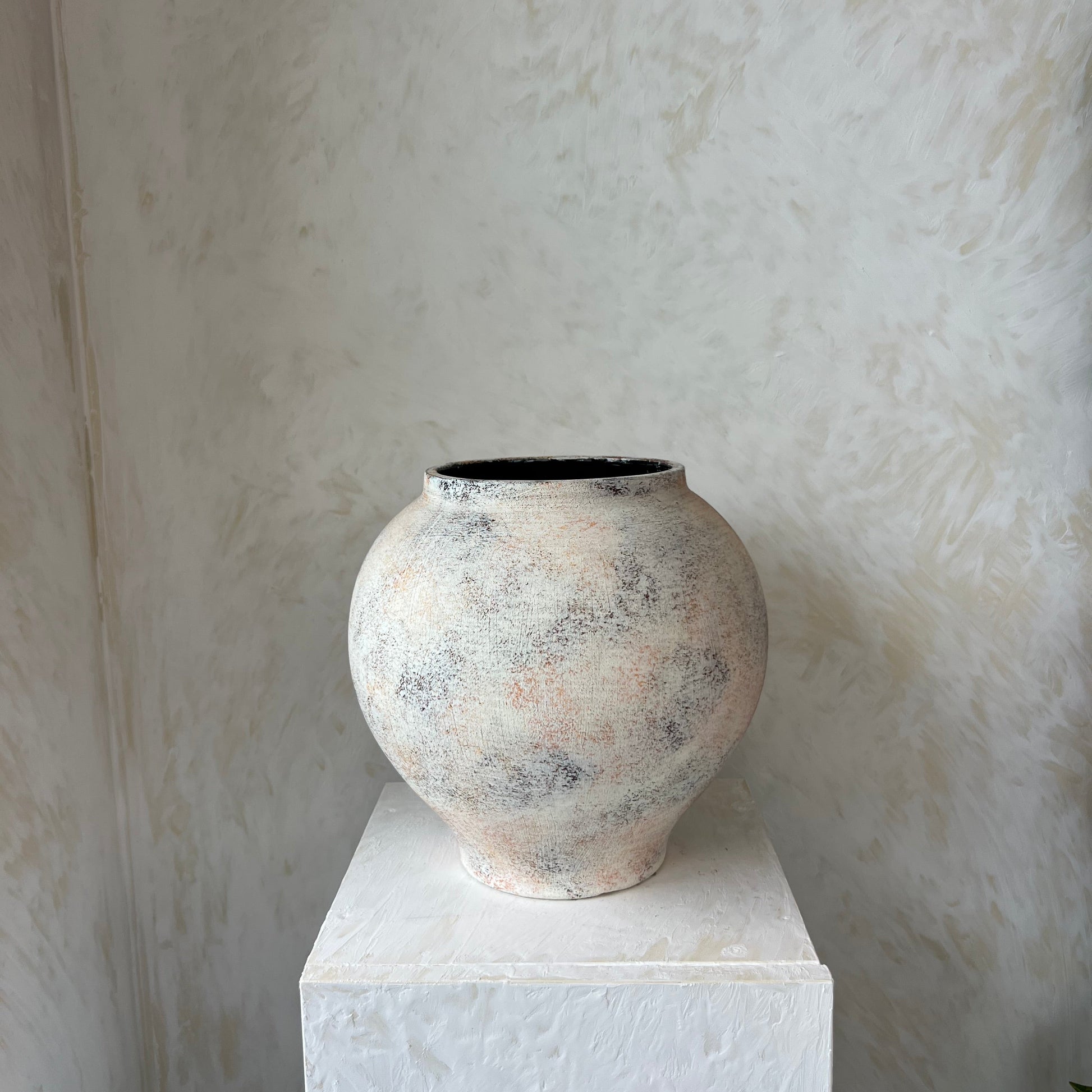 כלי קרמיקה רחב ובעל נוכחות פיסולית, בגימור אומנותי המשלב גוונים רכים של לבן, אפור ונגיעות חמות עדינות, היוצרים מראה עשיר, טבעי ומעודן. המרקם הייחודי מעניק לכל כלי אופי משלו – אין שניים זהים.