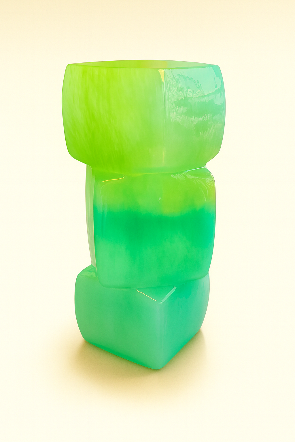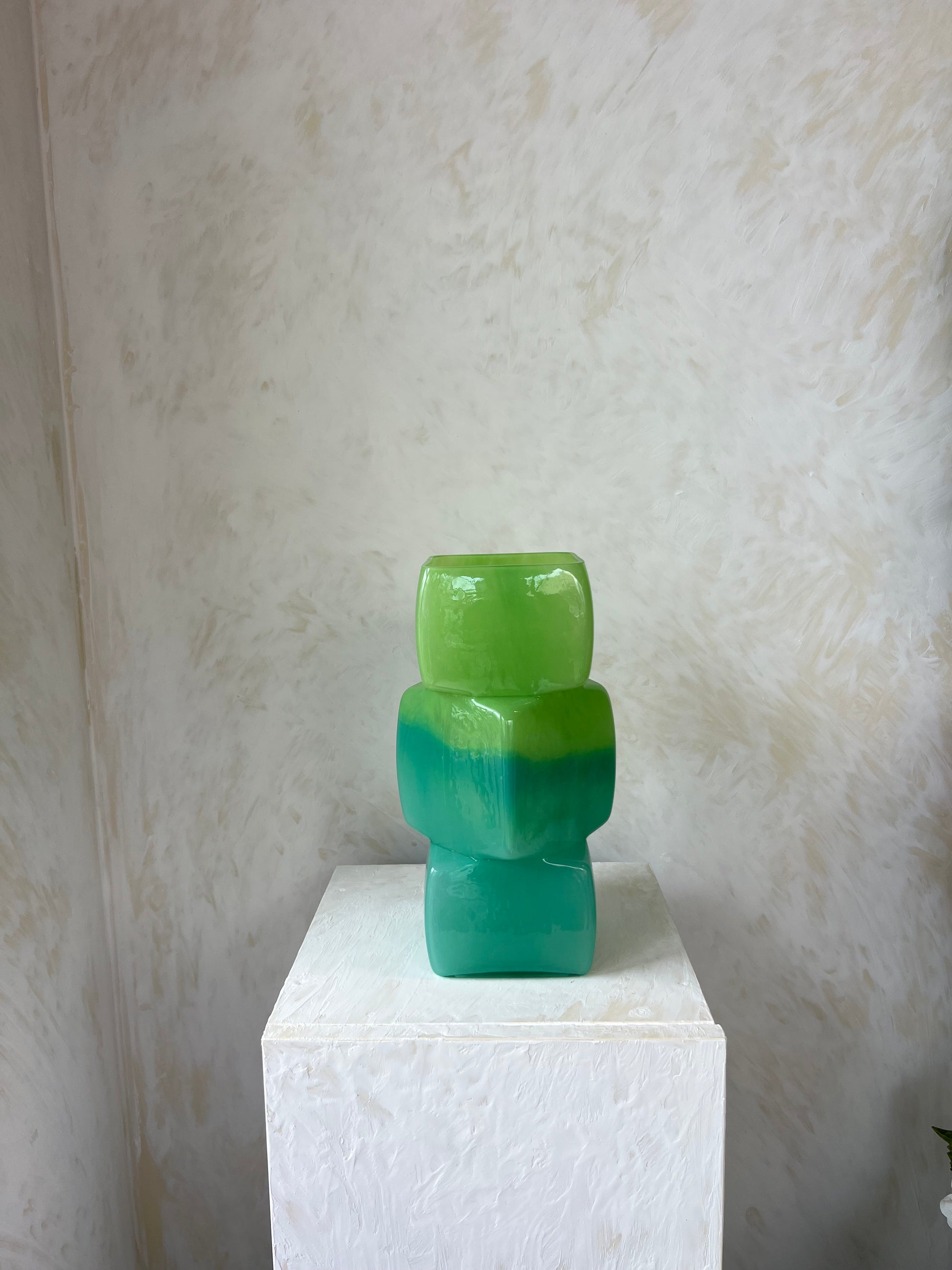 כלי זכוכית פיסולי ומרהיב, הבנוי משלוש קוביות גאומטריות בגווני ירוק וטורקיז המשתלבים בזרימה אורגנית ומודרנית. שילוב הצבעים והצורה המודולרית יוצר מראה אמנותי, נועז ומלא אופי – כזה שנראה יותר כמו פסל עיצוב מאשר כלי רגיל.
