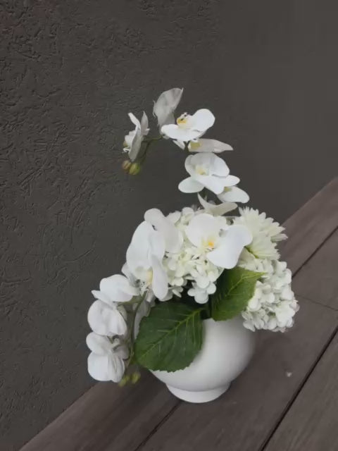 זר אלגנטי של פרחי הורטנזיה, גרברות וסחלבים לבנים, המשלב מראה טבעי, רך ונקי. הפרחים בעלי מרקם עדין ופתיחה מושלמת, היוצרים תחושת יוקרה ואור בבית. מתאים לעיצוב סלון, חדר שינה, מטבח או כמתנה מרשימה.