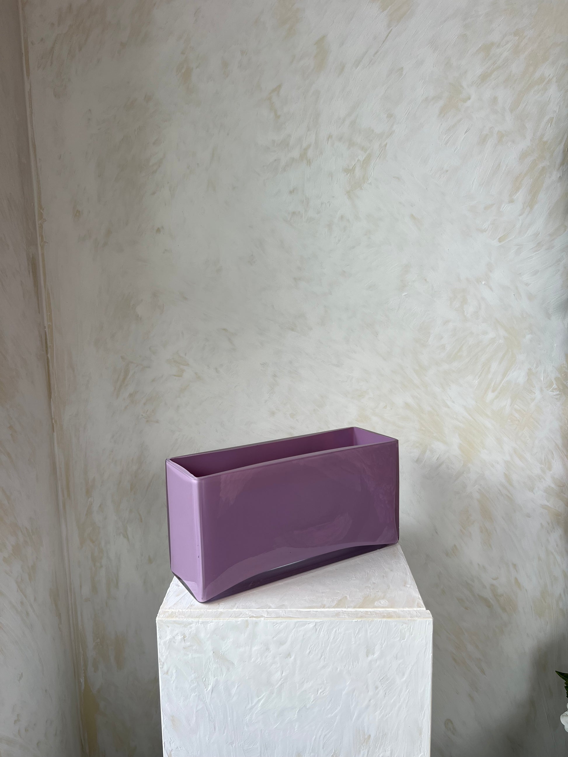 כלי זכוכית מודרני בקווים נקיים וגאומטריים, המעוצב כמלבן אלגנטי בגוון סגול רך ועמוק. הצורה המאורכת והמדויקת מעניקה לכלי מראה אדריכלי ועכשווי, כזה שמוסיף סטייטמנט עיצובי שקט אך מלא נוכחות.