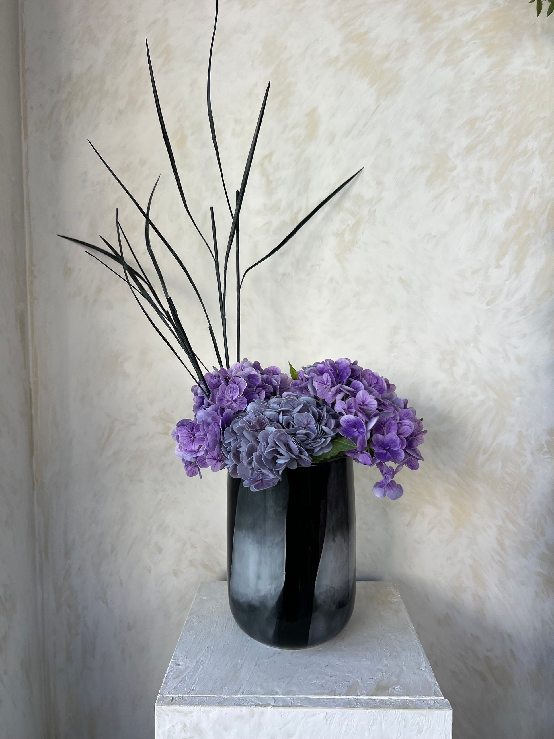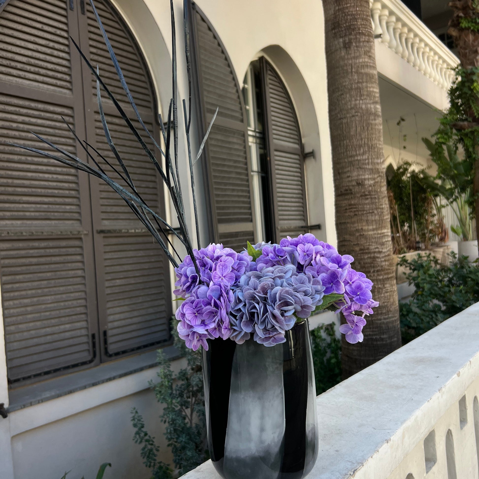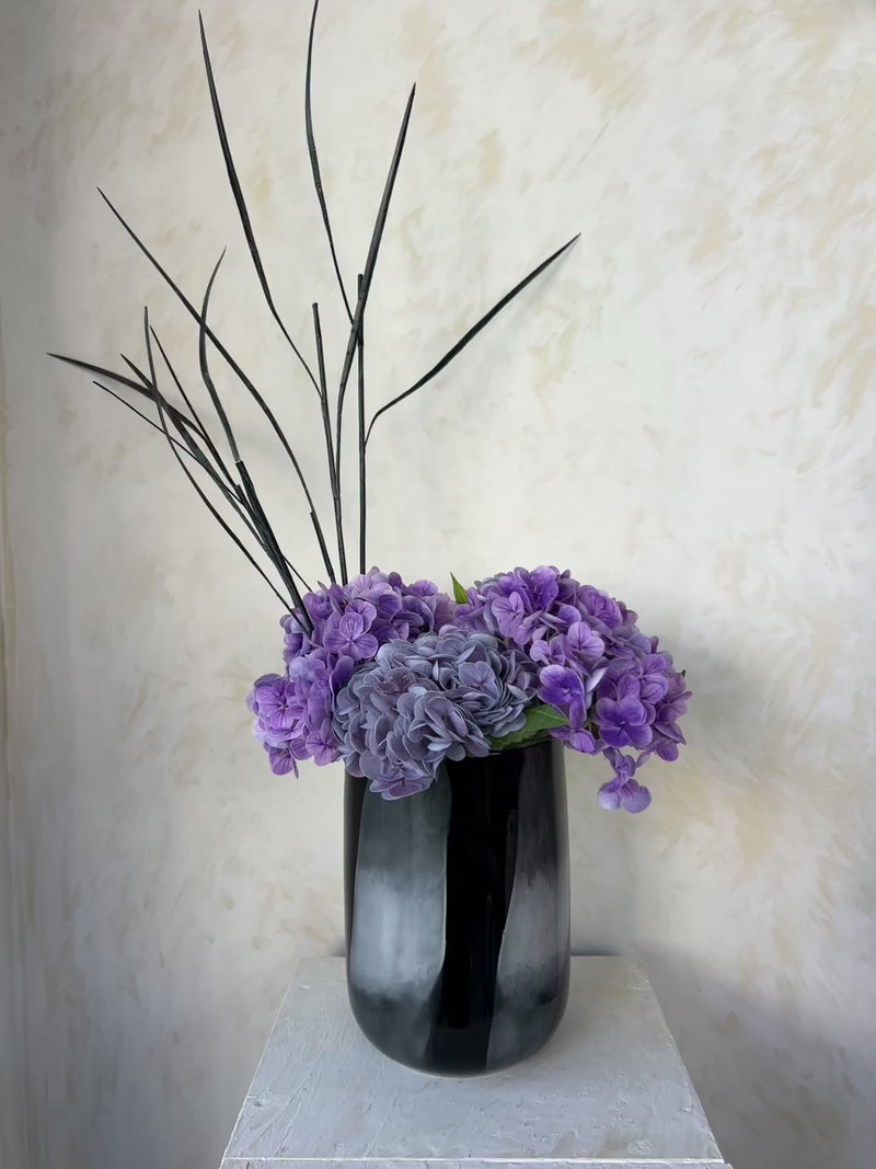 4 גבעולי הורטנזיה בגווני סגול עם ענפים חומים.