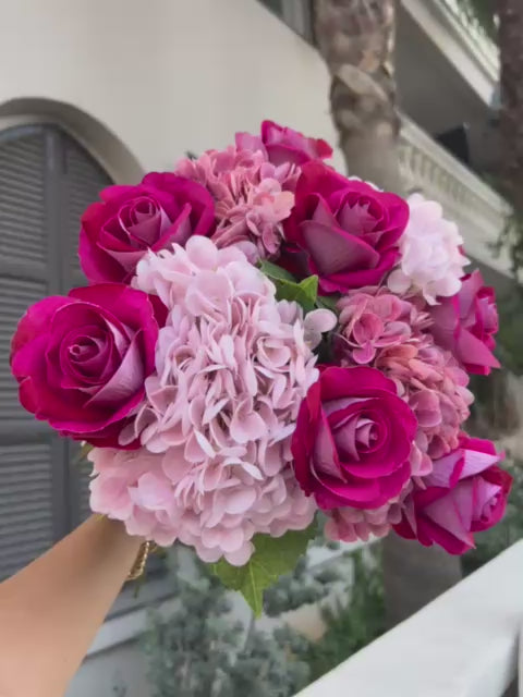 זר מרהיב בגווני ורוד פוקסיה, המשלב ורדים ורודים עזים לצד הורטנזיות ורודות רכות במרקם עשיר. שילוב הצבעים יוצר מראה אלגנטי, מודרני ומלא נוכחות — זר שמוסיף עומק, רומנטיות ואמירה יוקרתית לכל חלל.