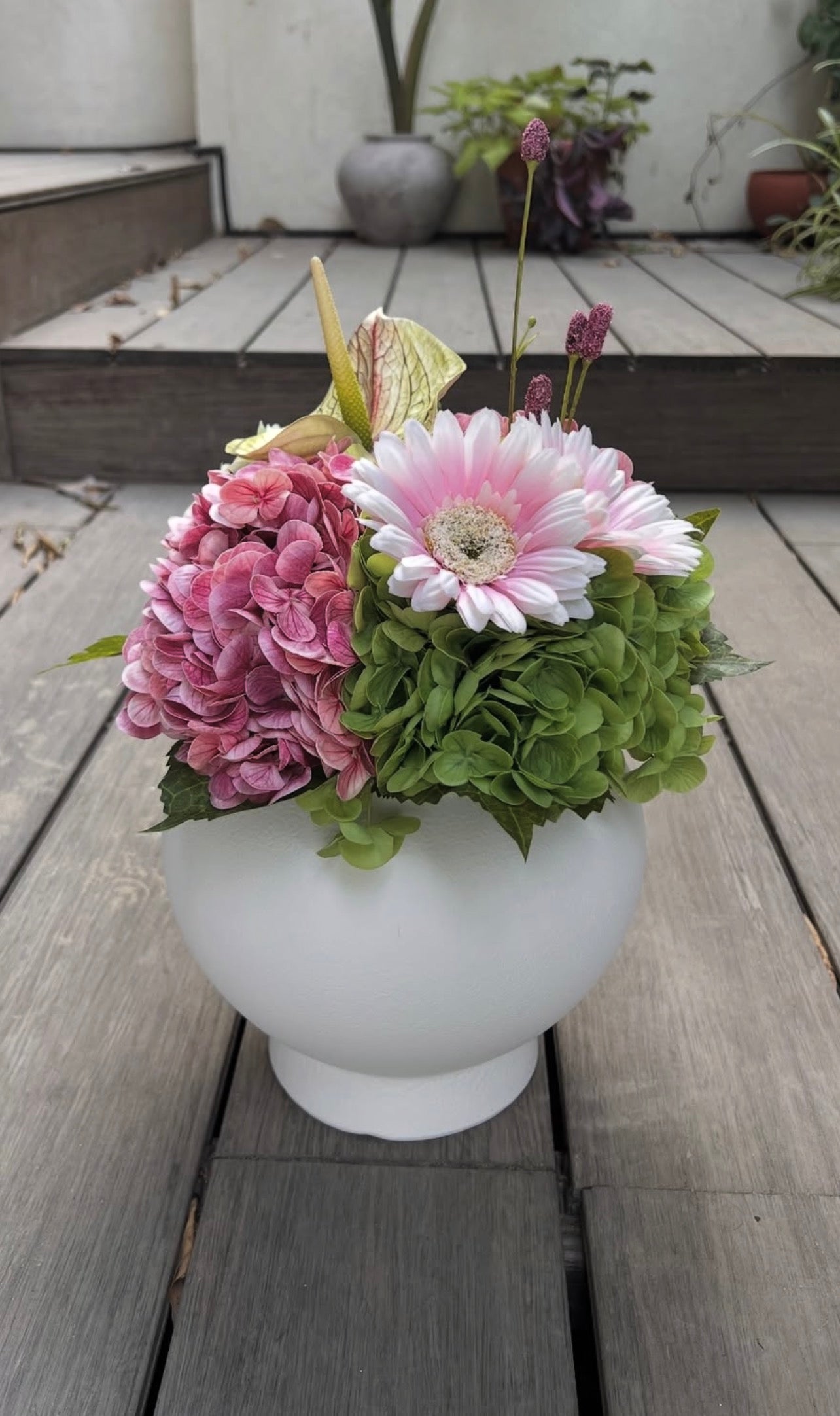 2 גבעולי הורטנזיה ירוק וורוד, 2 גרברות ורודות, אנטוריום ירוק וחמנית