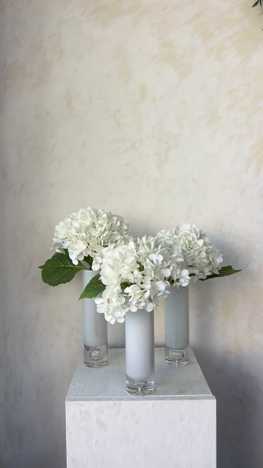 הפרחים משולבים בכלי זכוכית גליליים בגימור לבן חלבי, המעניקים לקומפוזיציה תחושת עומק, ניקיון ועיצוב מודרני־על־זמני.