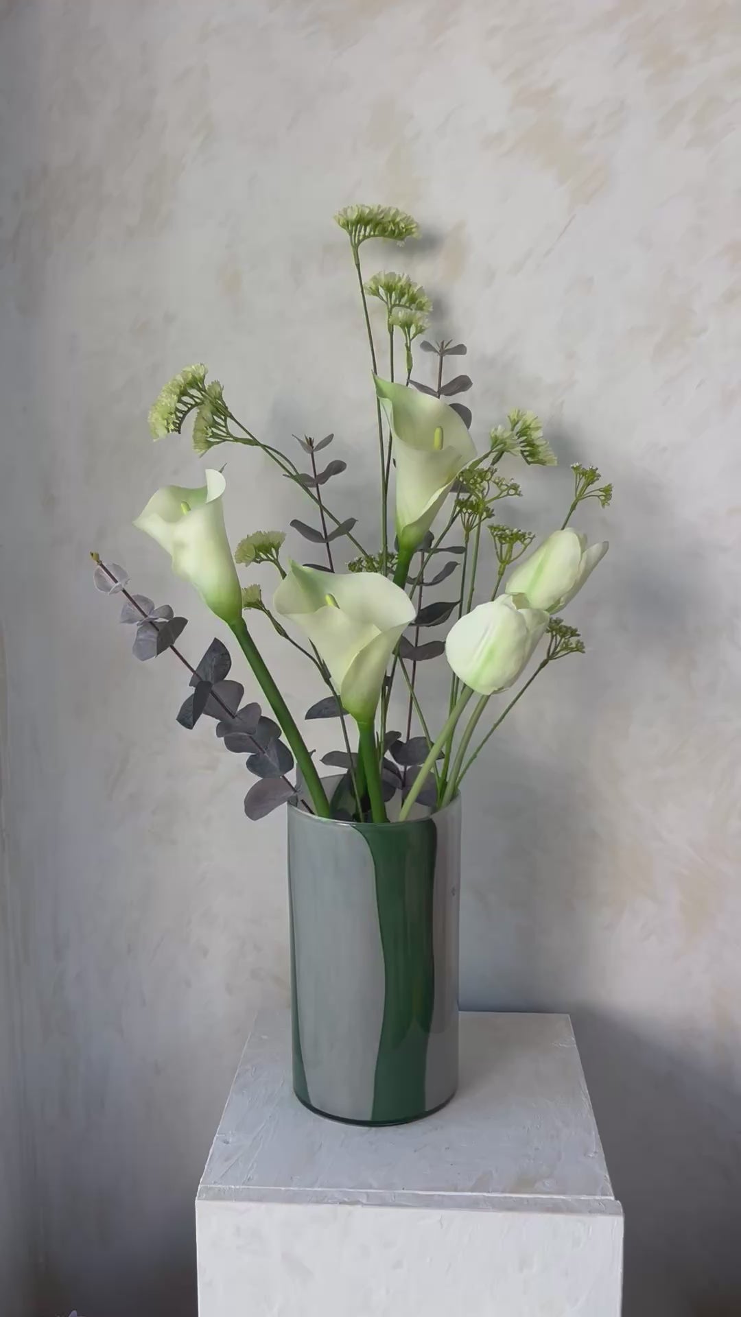 הקומפוזיציה כוללת קאלות לבנות בעלות קו פיסולי נקי, טוליפים לבנים סגורים למחצה שמוסיפים רכות ועידון, ופרחי סטטיס ירקרק על גבעולים דקים שמעניקים תנועה ואווריריות. בין הפרחים משולבים ענפי אקליפטוס בגוון ירוק־אפרפר שמוסיפים עומק וטקסטורה טבעית.