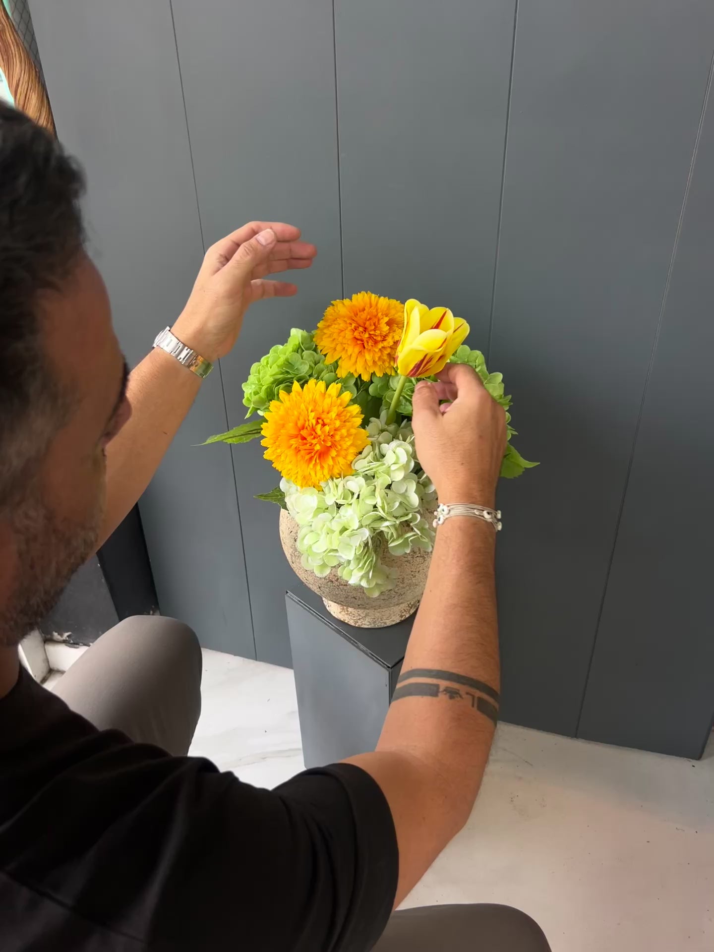 סידור פרחי משי מרענן ומשמח, המשלב הידרנג’ות ירוקות עשירות לצד גרברות כתומות ובוהקות, עם נגיעה אלגנטית של לילו צהוב-כתום שמוסיף טוויסט אלגנטי ומואר. שילוב הצבעים הירוק-ליים עם כתום חי יוצר נוכחות מודרנית, צעירה וסוחפת, שמתאימה לכל חלל שרוצים להאיר בנגיעה של שמחה וטבע.