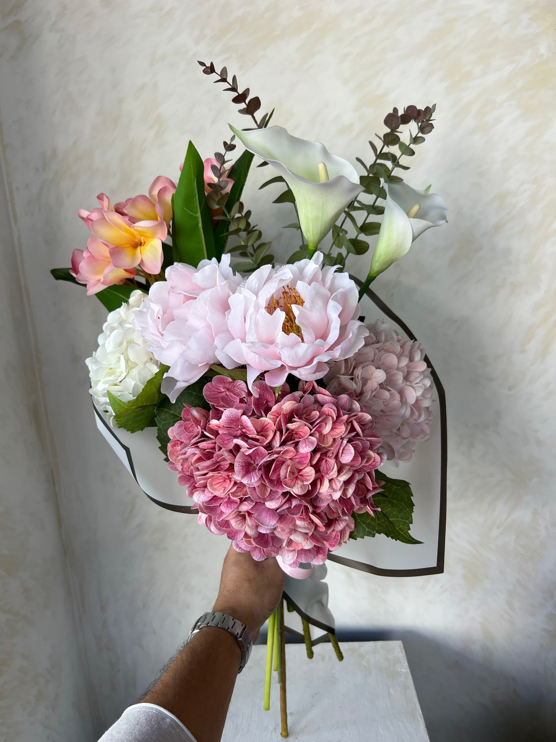 3 גבעולי הורטנזיות בגוונים של ורוד ולבן, 2 פינוים ורודות, 2 קלה לבנה , פיטנה ורודה ואקליפטוס