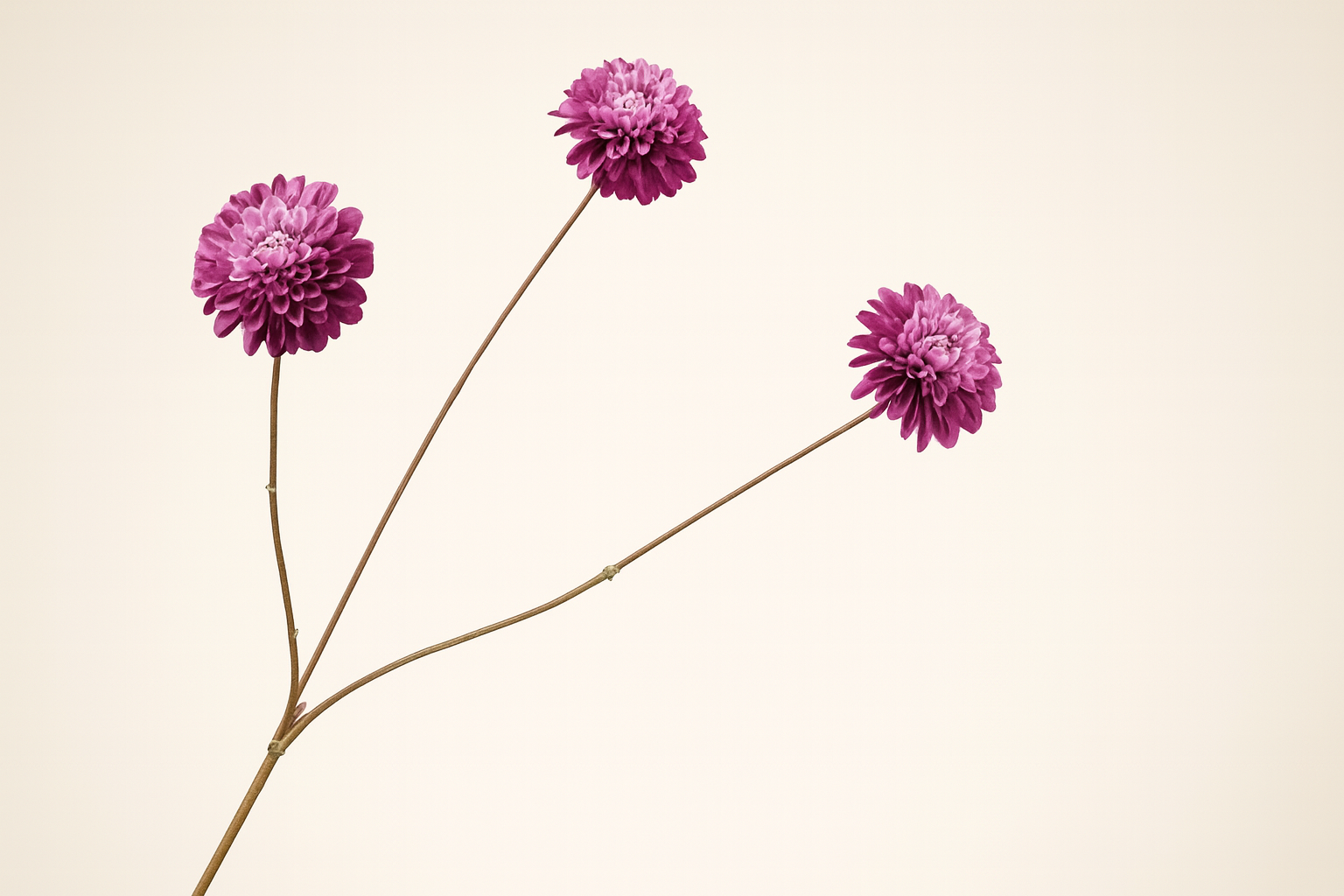 ענף דליה מרהיב באורך 65 ס"מ, בגוון סגול עמוק ומרשים שמעניק לכל חלל תחושת יוקרה, עומק ואלגנטיות. הפריחה העשירה והעגולה, עם שכבות עלי כותרת רכות, יוצרת מראה דרמטי ומלא אופי – מושלם כסוליסט או כחלק מסידור פרחים מגוון.